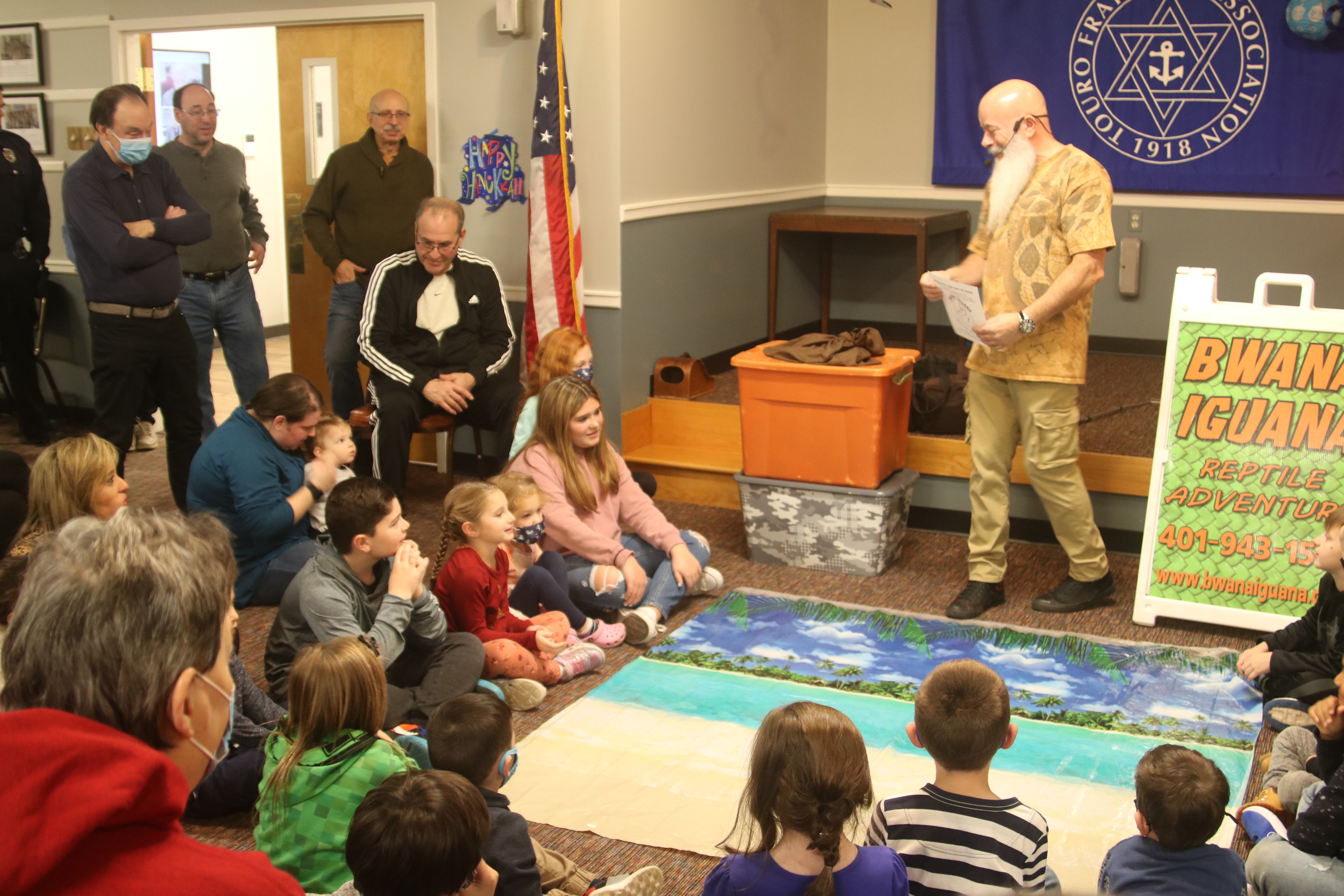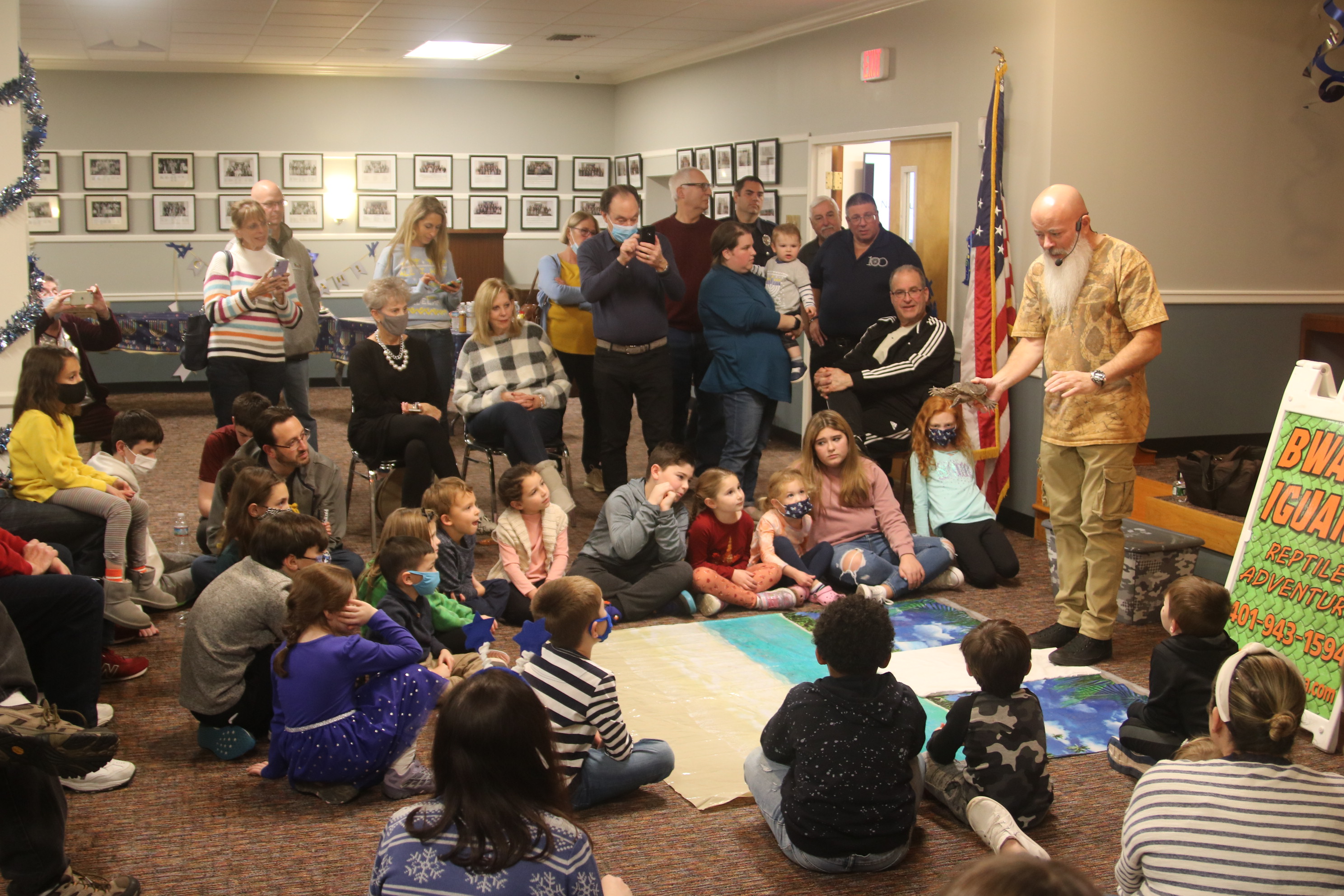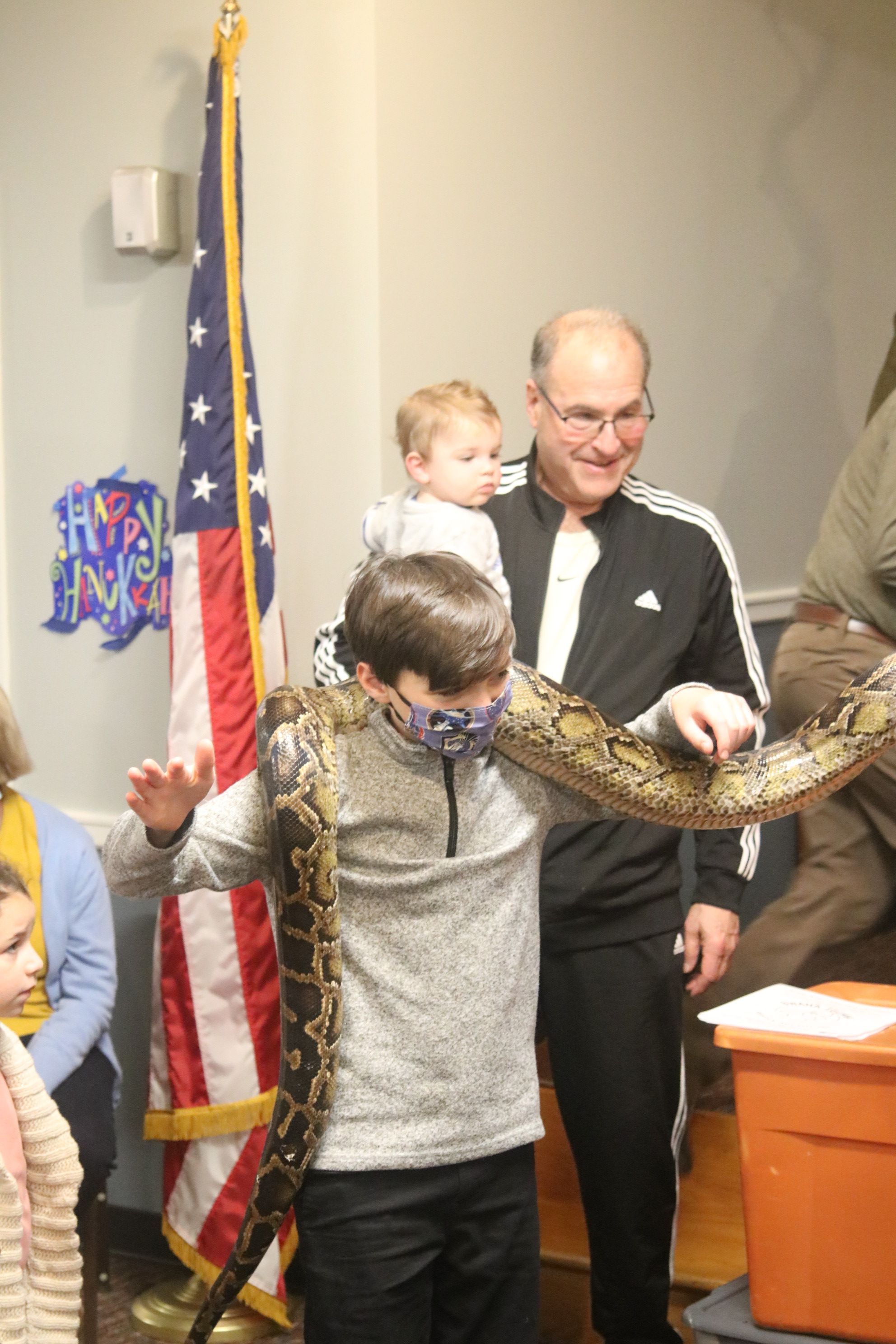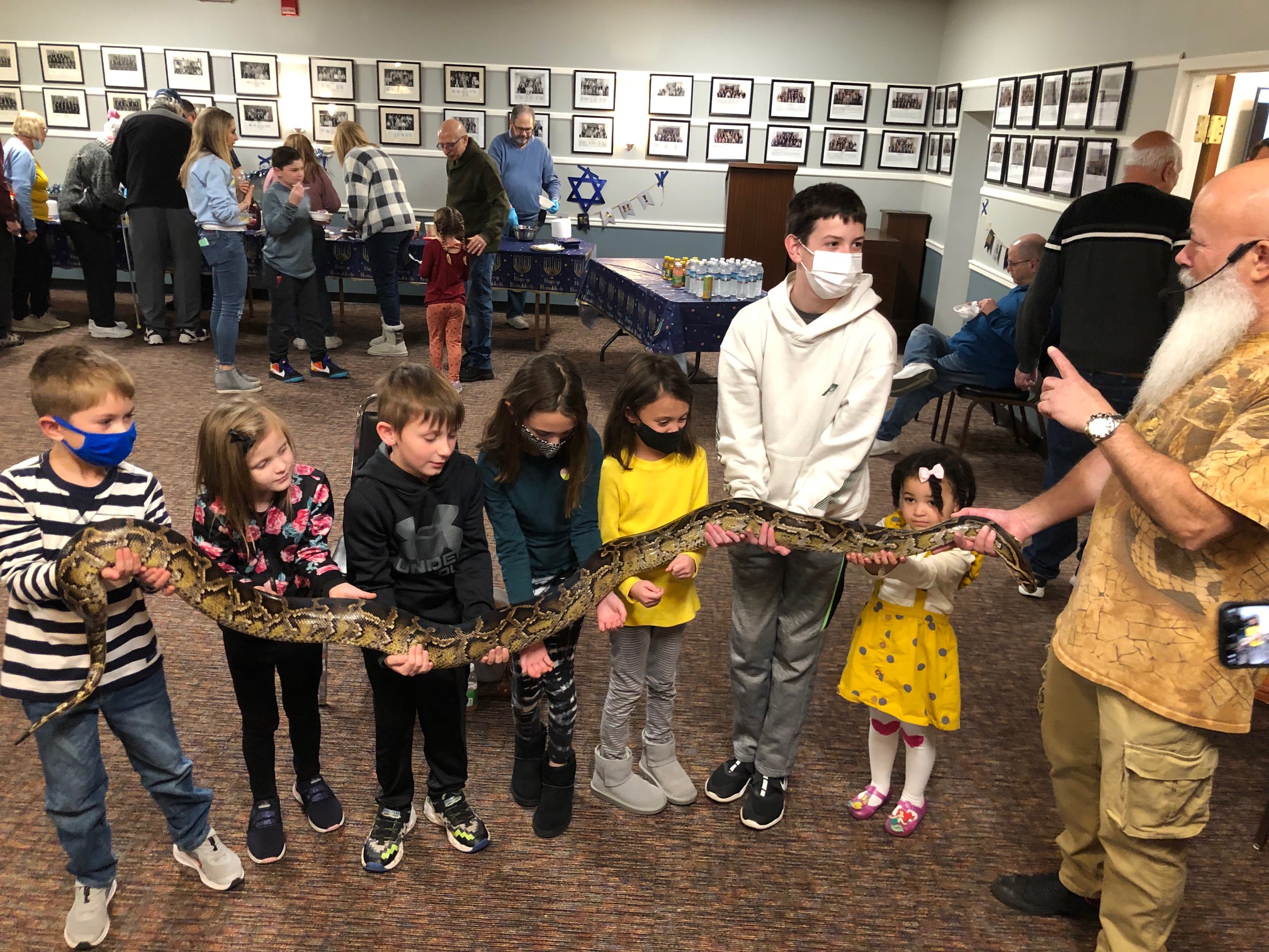 Children of all ages were delighted by a reptile show at the annual Chanukah Party at Touro Hall on December 5, 2021. The kitchen was dedicated to the late Nate Lury at the event.
