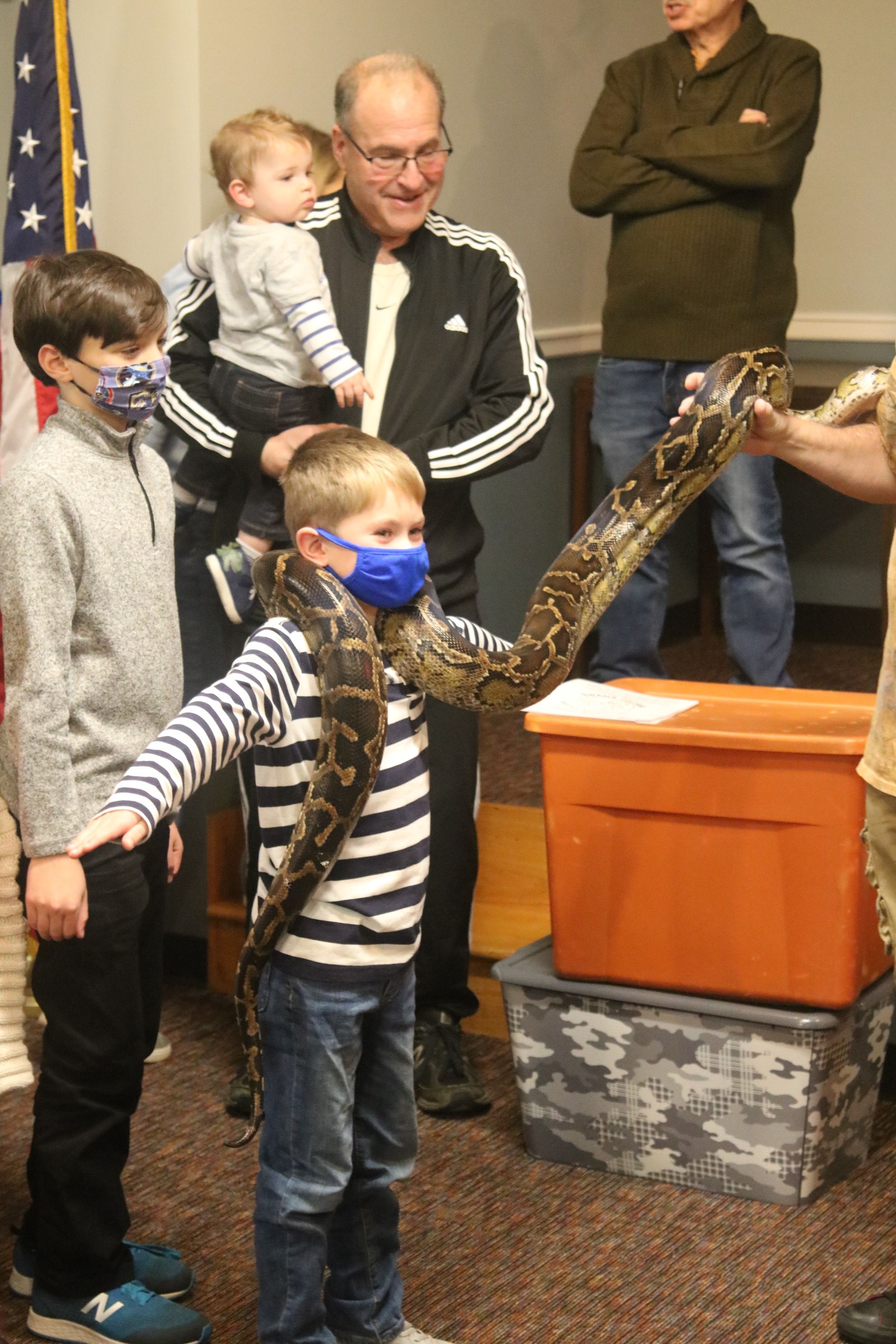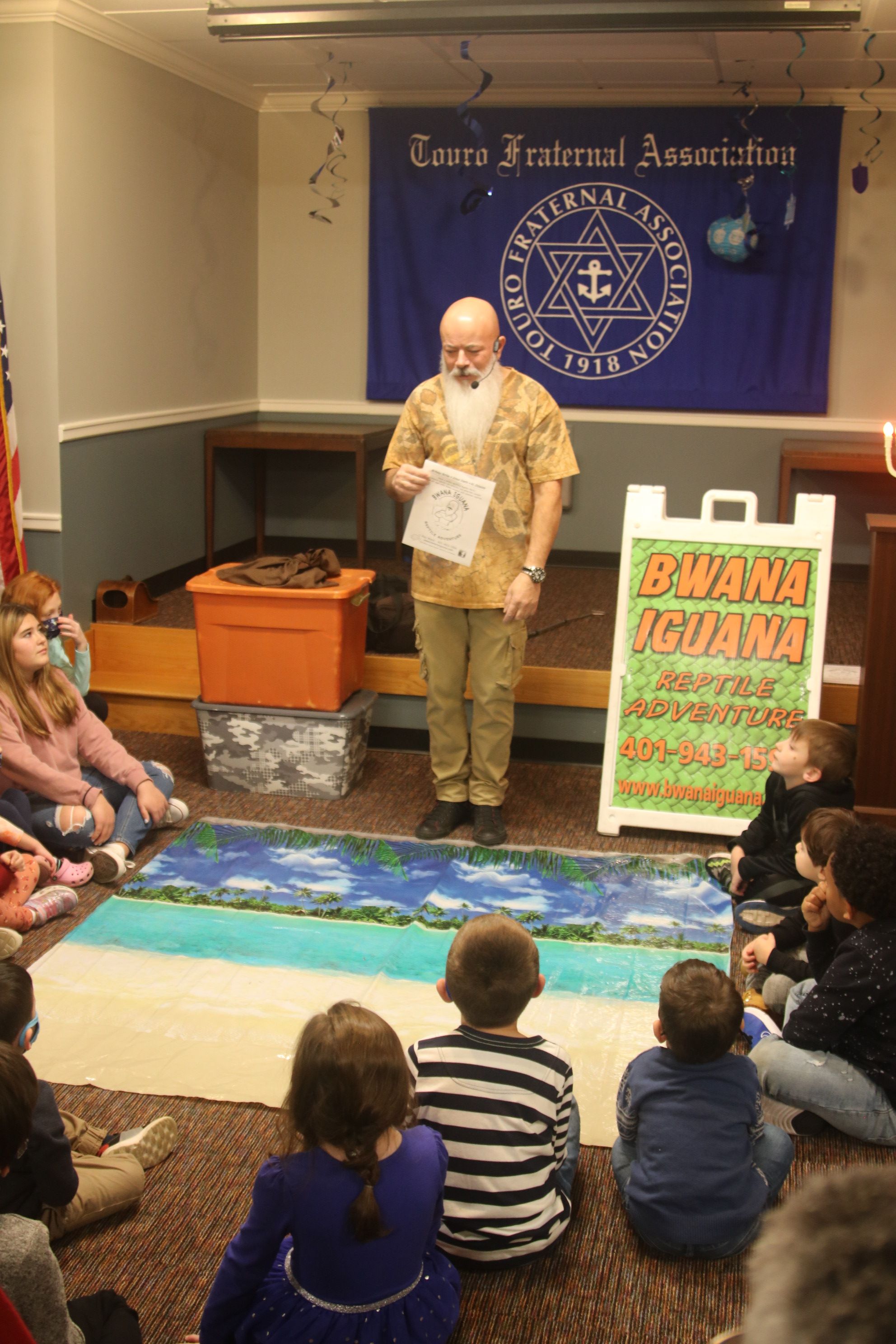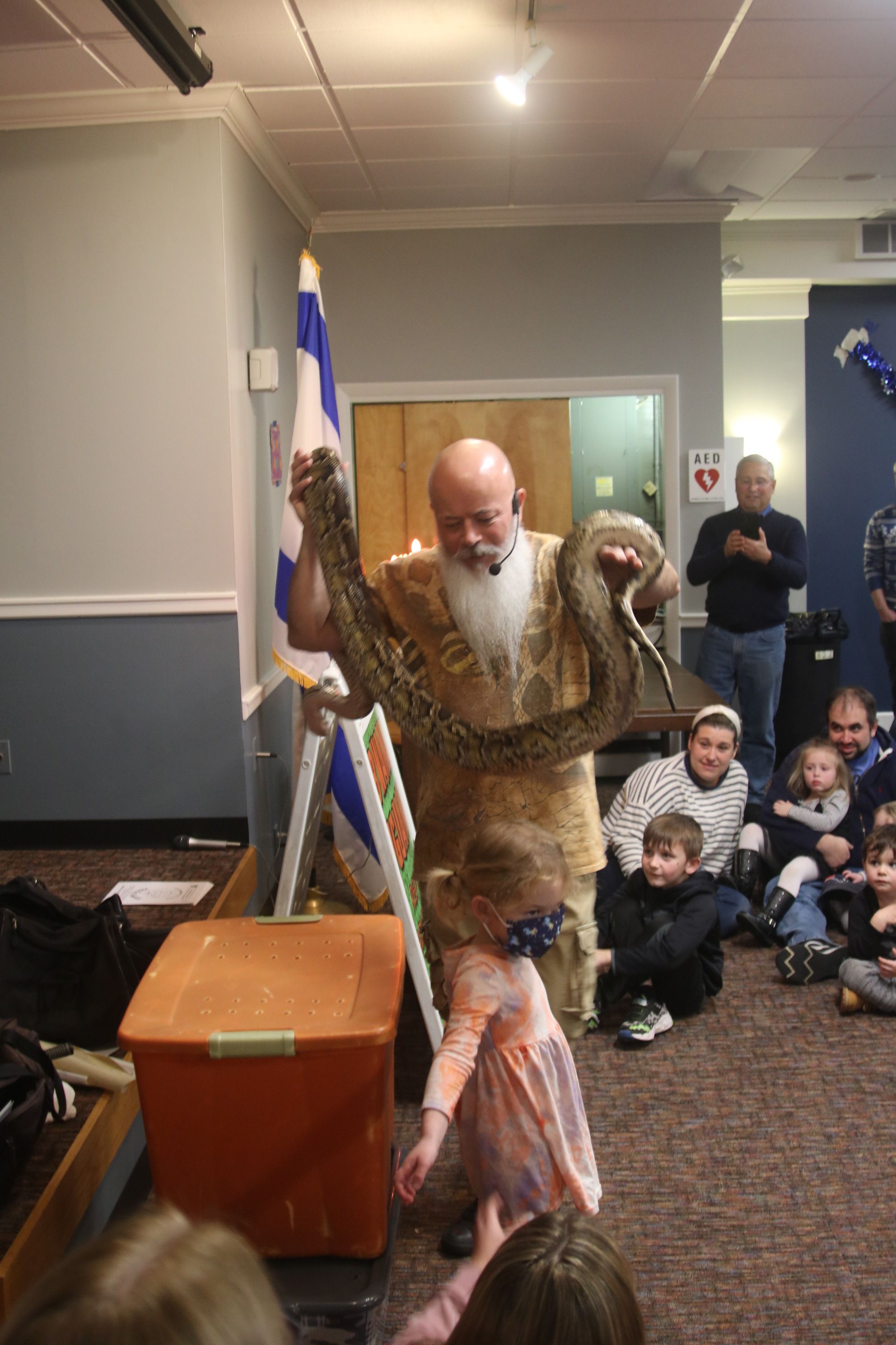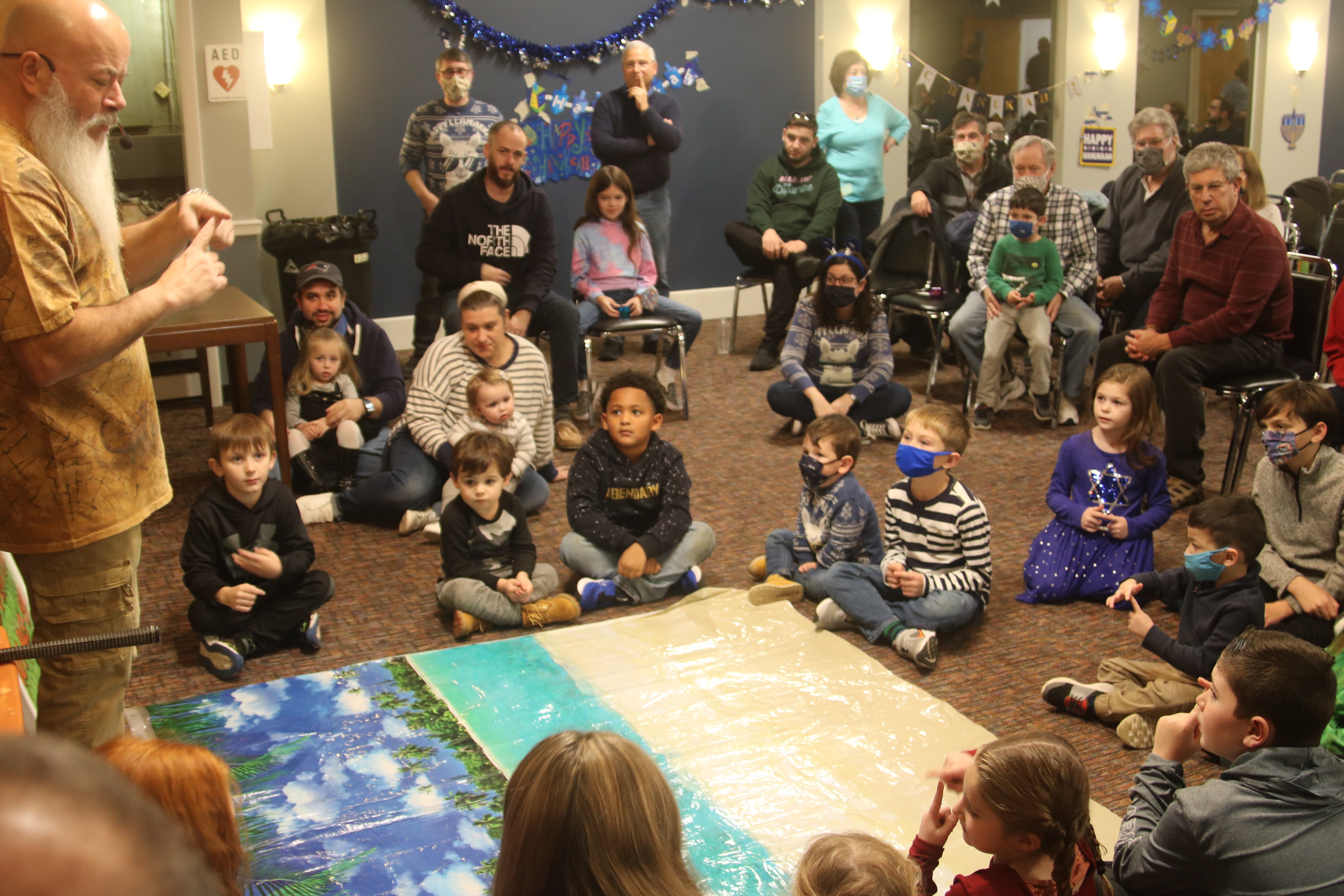 Children of all ages were delighted by a reptile show at the annual Chanukah Party at Touro Hall on December 5, 2021. The kitchen was dedicated to the late Nate Lury at the event.