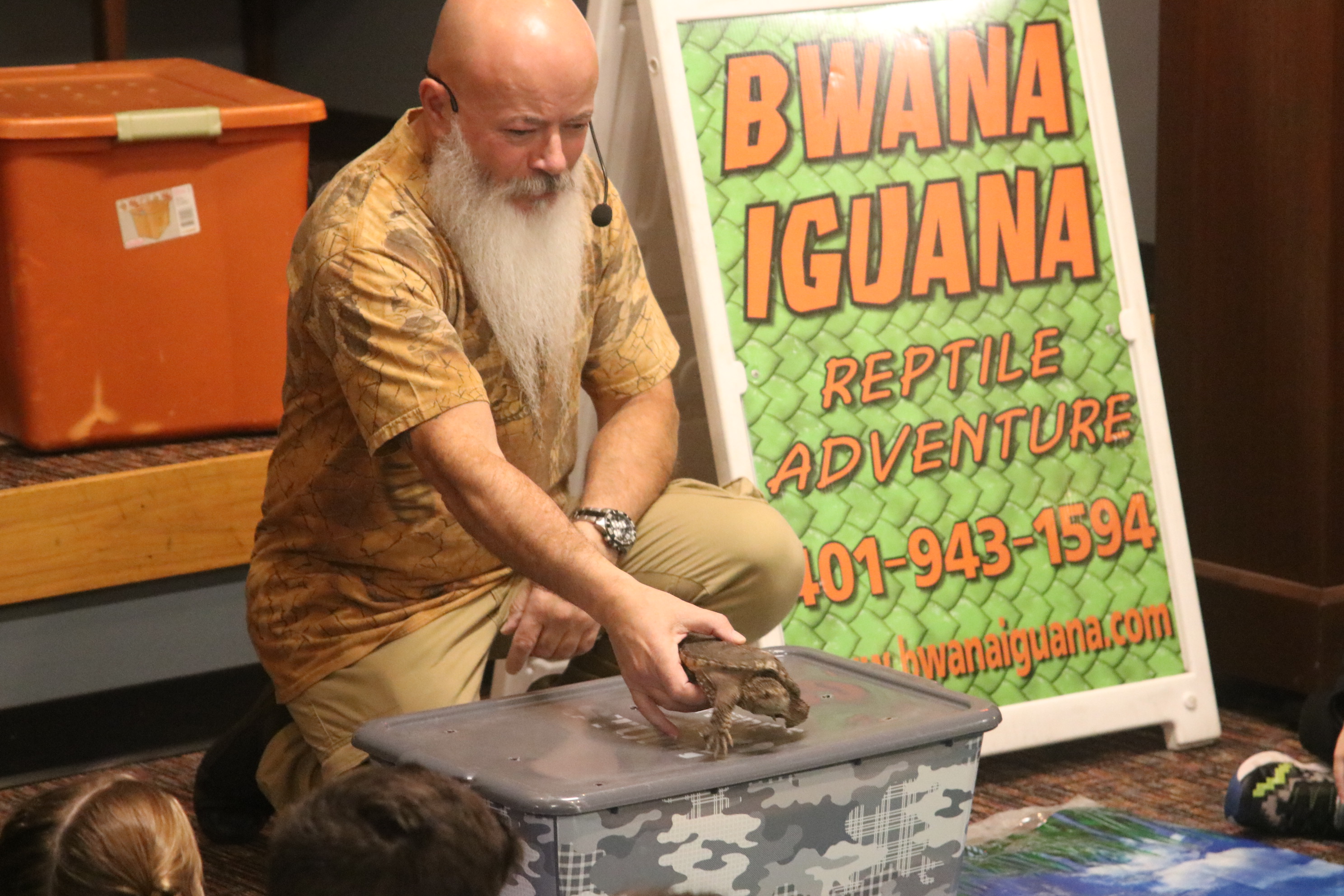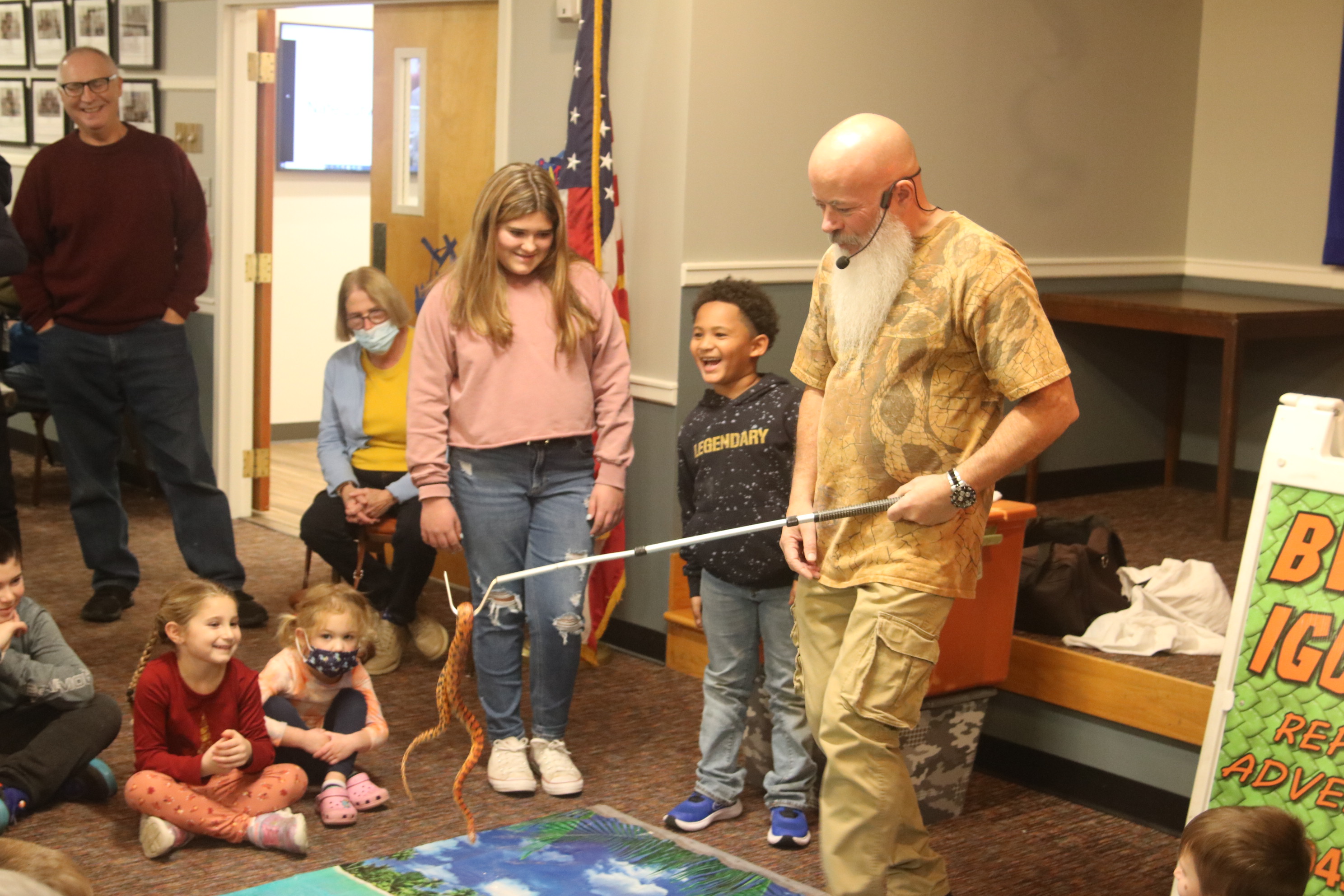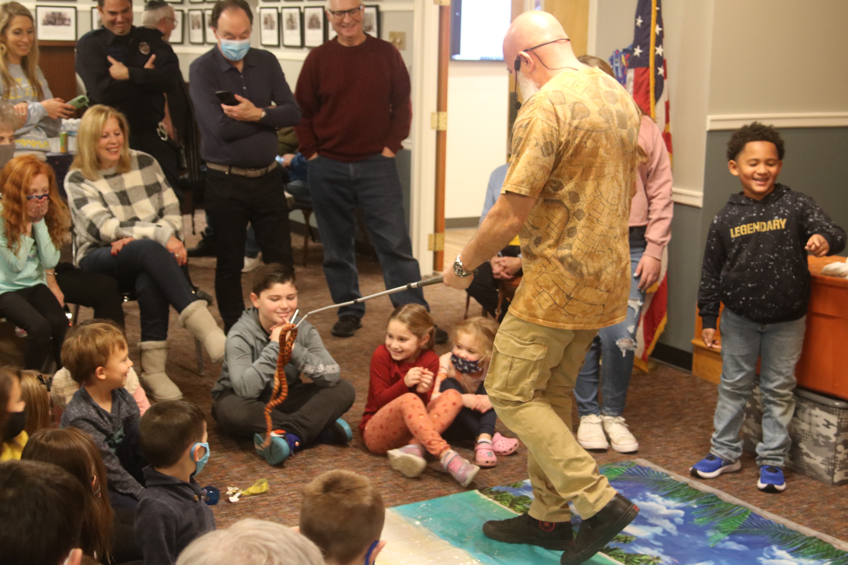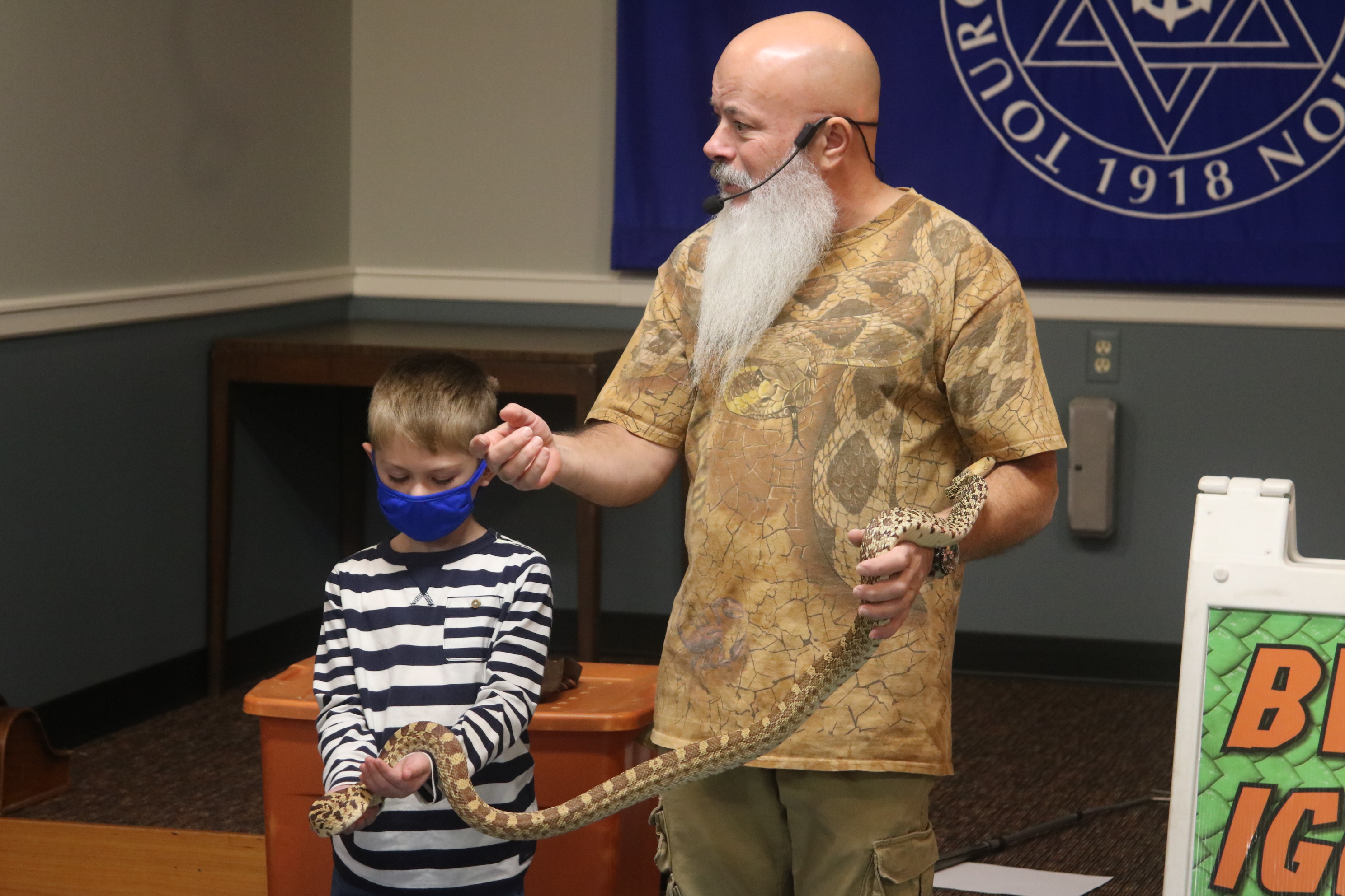 Children of all ages were delighted by a reptile show at the annual Chanukah Party at Touro Hall on December 5, 2021. The kitchen was dedicated to the late Nate Lury at the event.