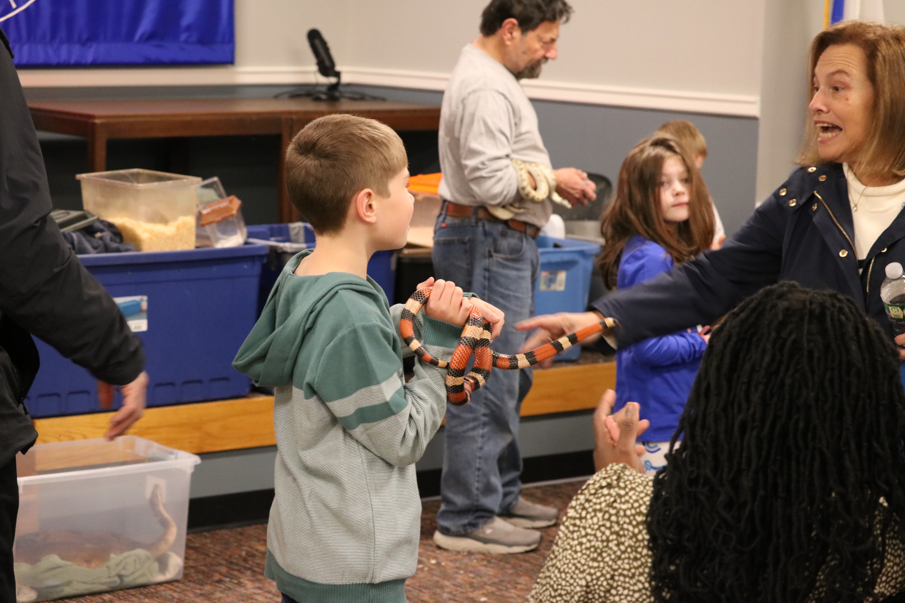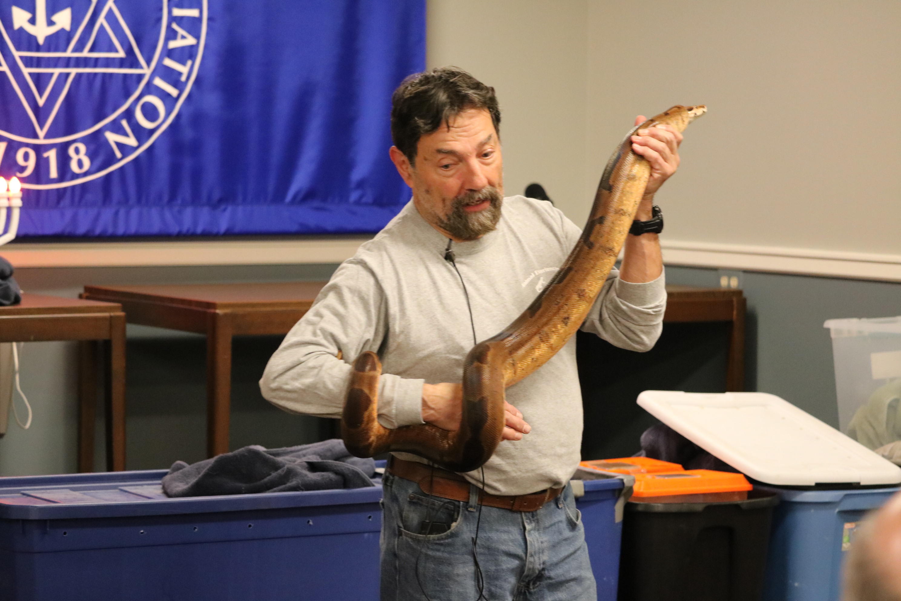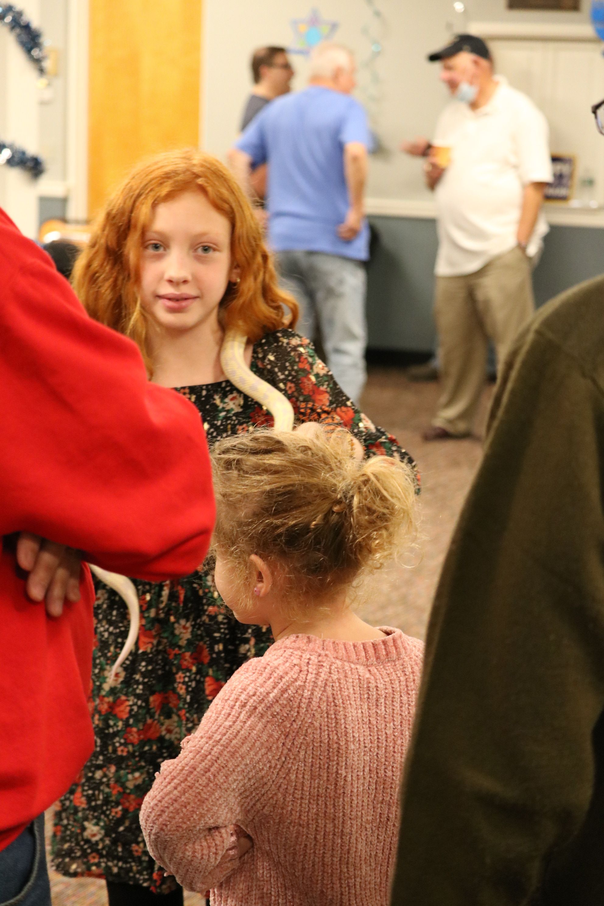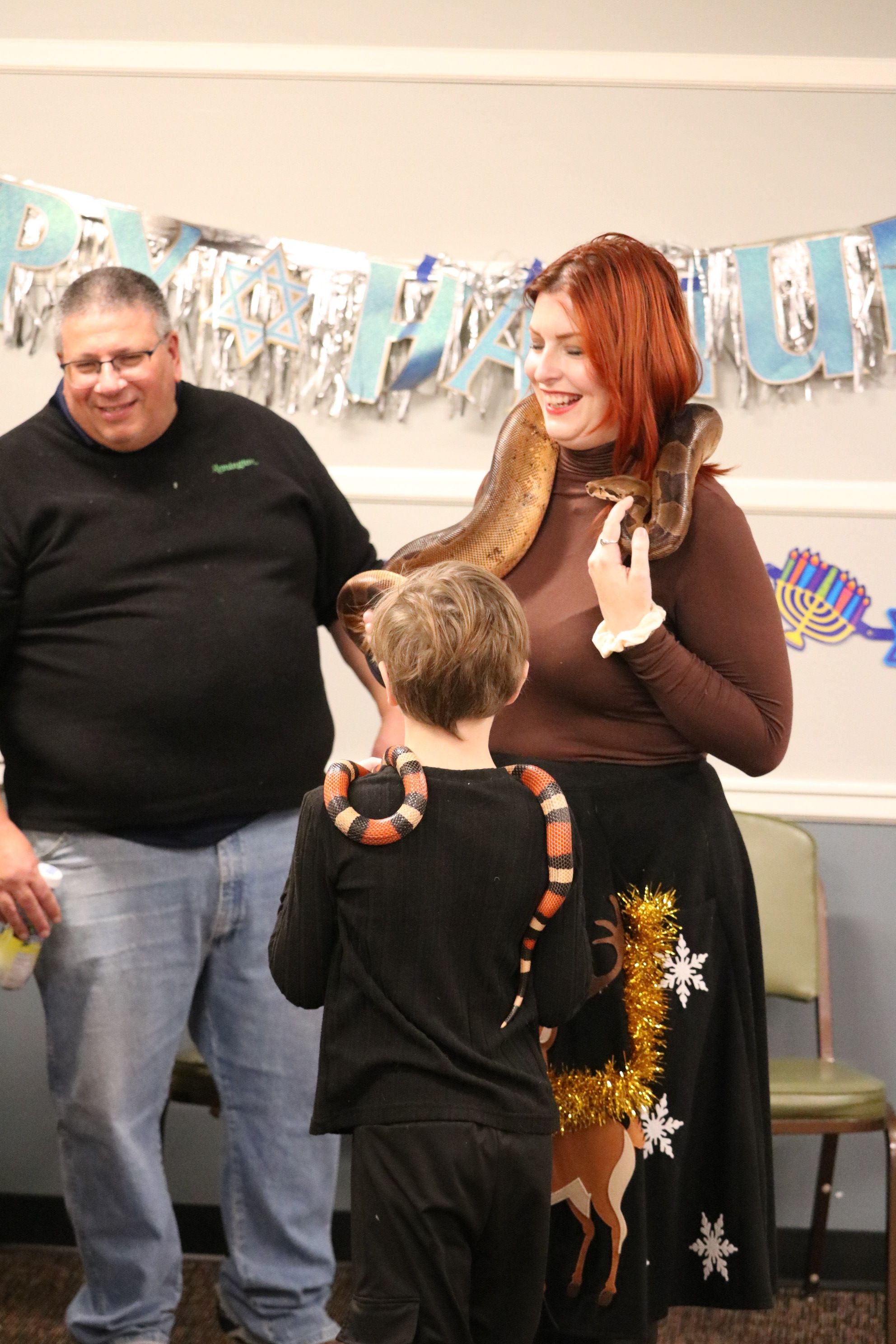 About 100 Touro members and guests, including dozens of children and grandchildren, enjoyed the Chanukah Family Party featuring Dave Marchetti's Animal Experiences on December 3, 2023 at Touro Hall. After eating hot dogs, latkes, cookies and cupcakes, the children interacted with turtles, snakes, lizards and a bunny, while seeing an alligator up close.